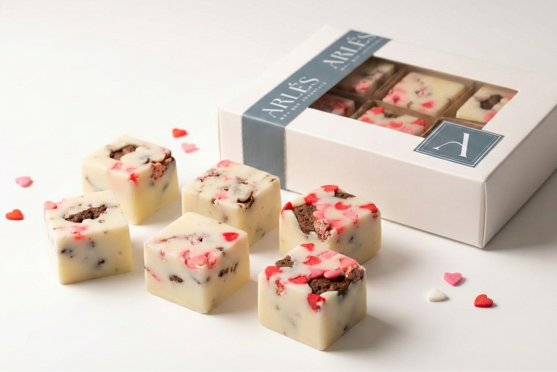 Bombón artesanal de chocolate blanco que envuelve una combinación delicada de galletitas de cacao y frutilla, con pequeños destellos de confeti que celebran lo lúdico y lo compartido.